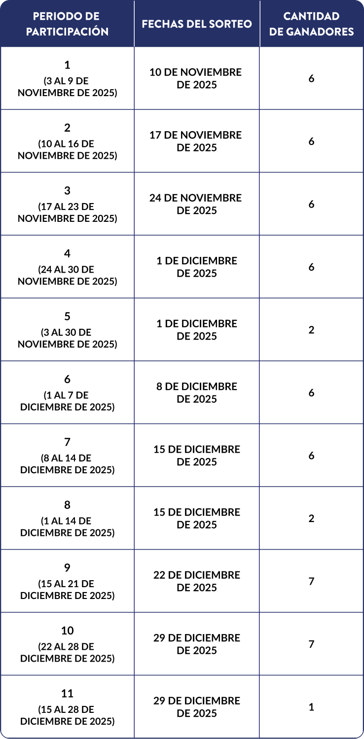 DURACIÓN: El Sorteo “Promo Navidad con Ritz® 2025” (el “Sorteo”) comienza el 3 de noviembre de 2025 al 28 de diciembre de 2025 (en adelante, el “Periodo del Sorteo”). El Periodo del Sorteo se dividirá, a su vez, en los siguientes “Periodos de Participación”: