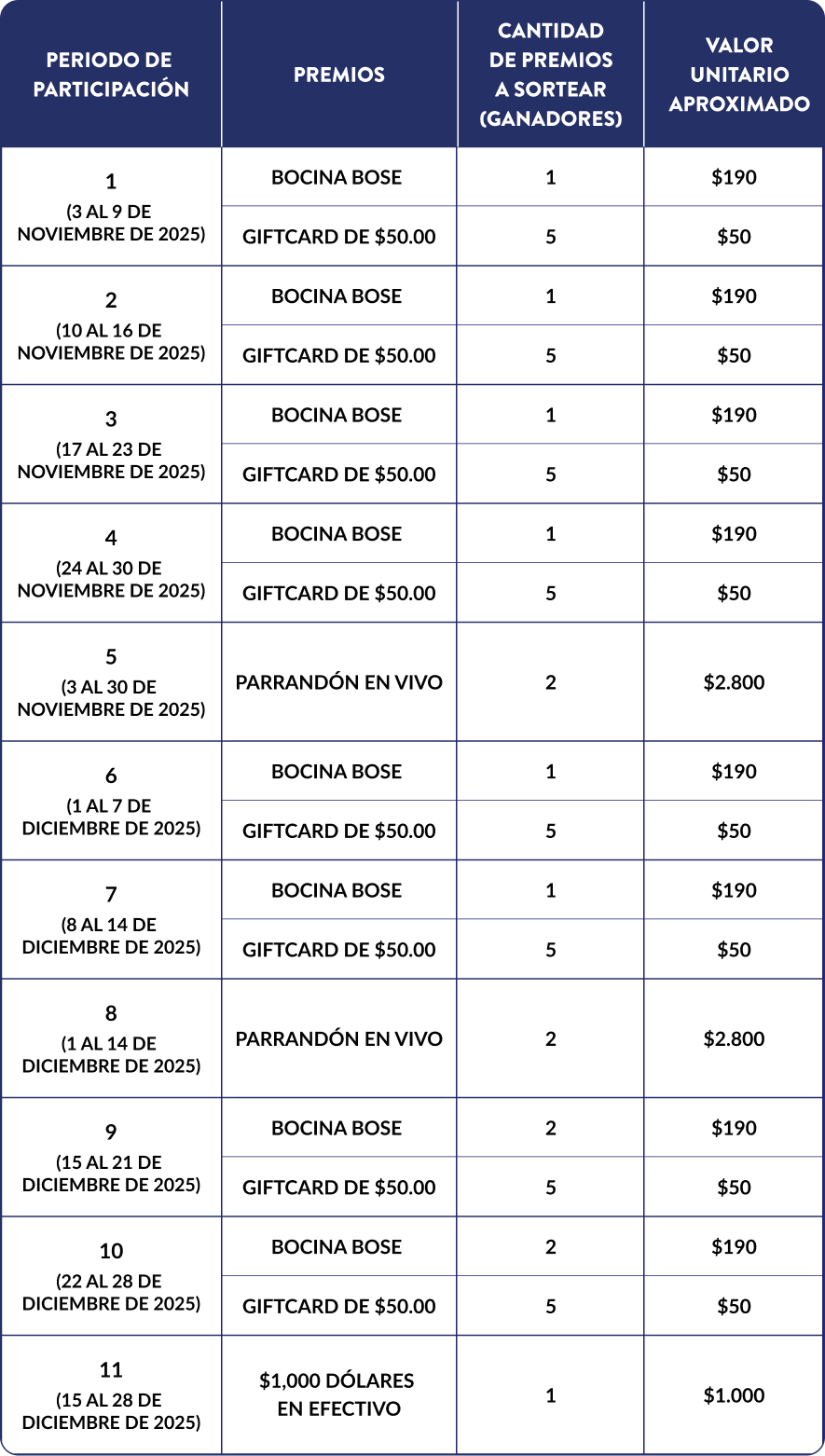 *El Precio de los Premios puede fluctuar según valor en el mercado al momento de la compra. Los Precios no incluyen impuestos ni garantías. Sujeto a disponibilidad en el mercado.